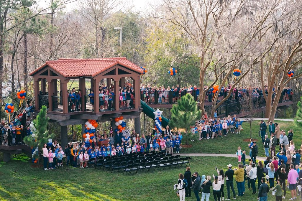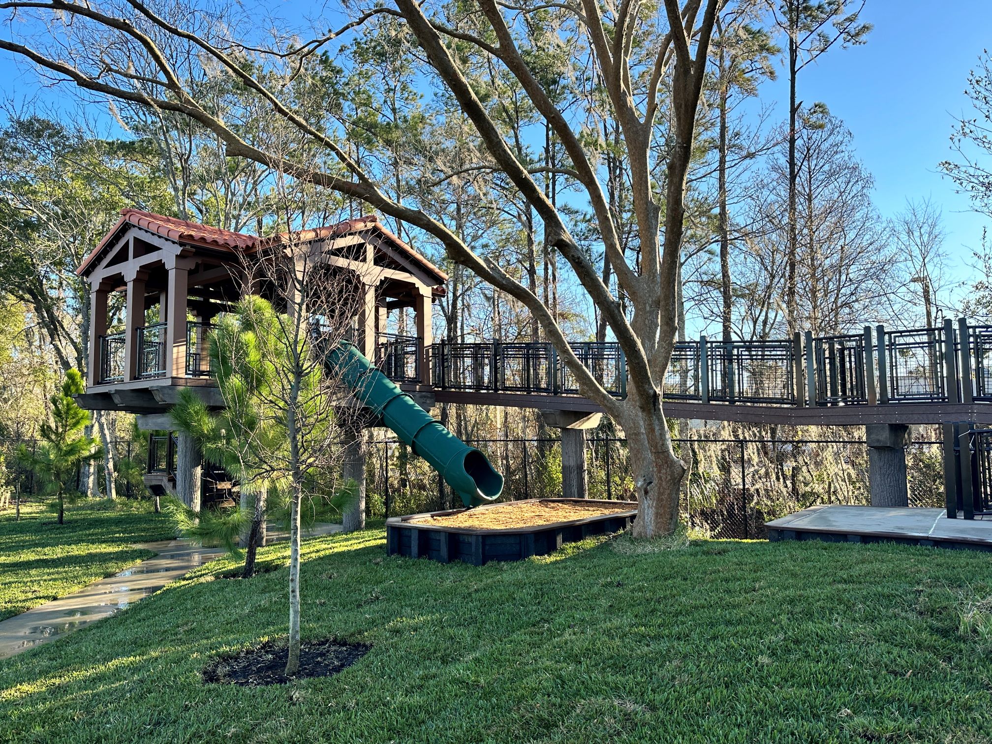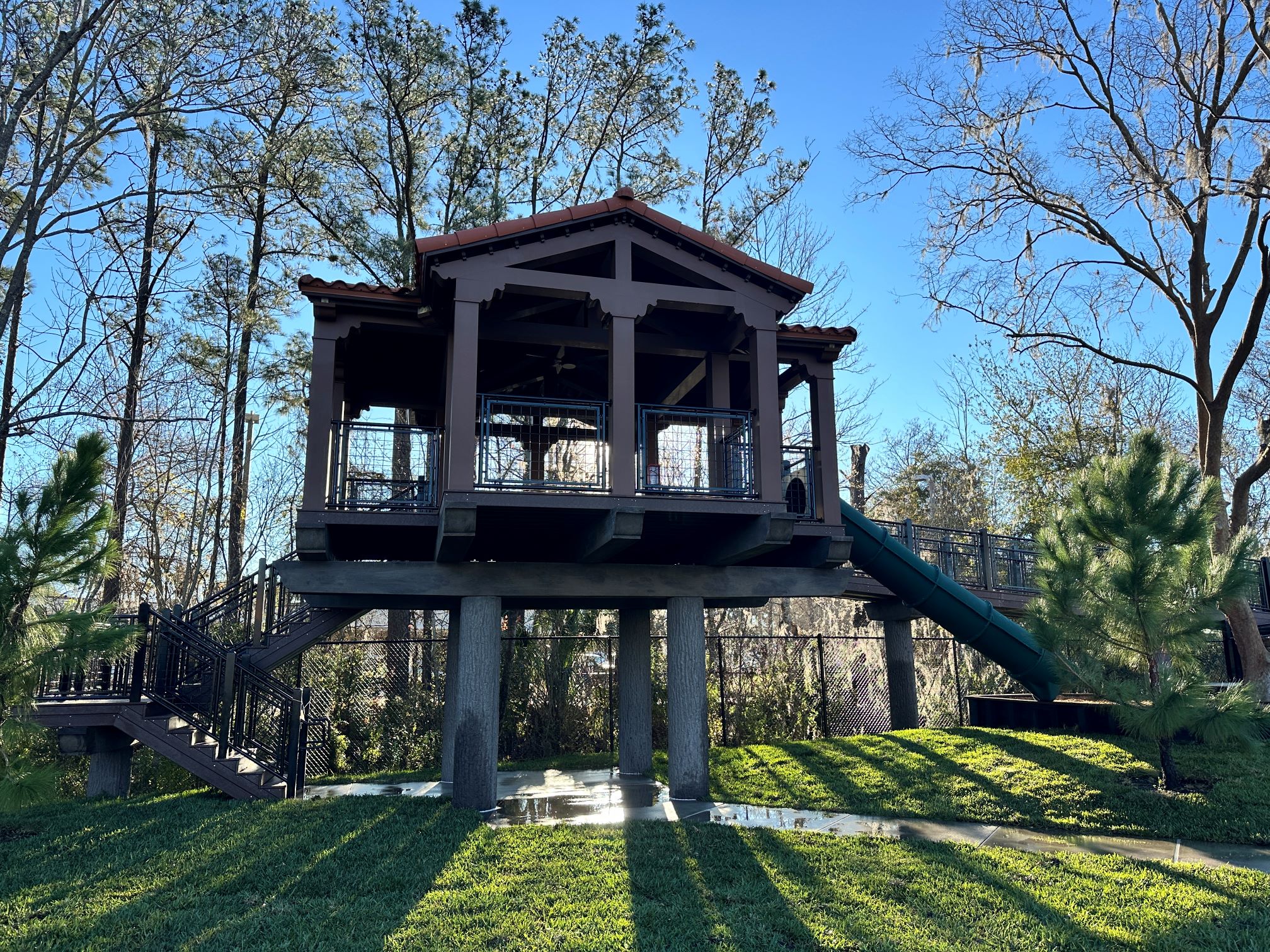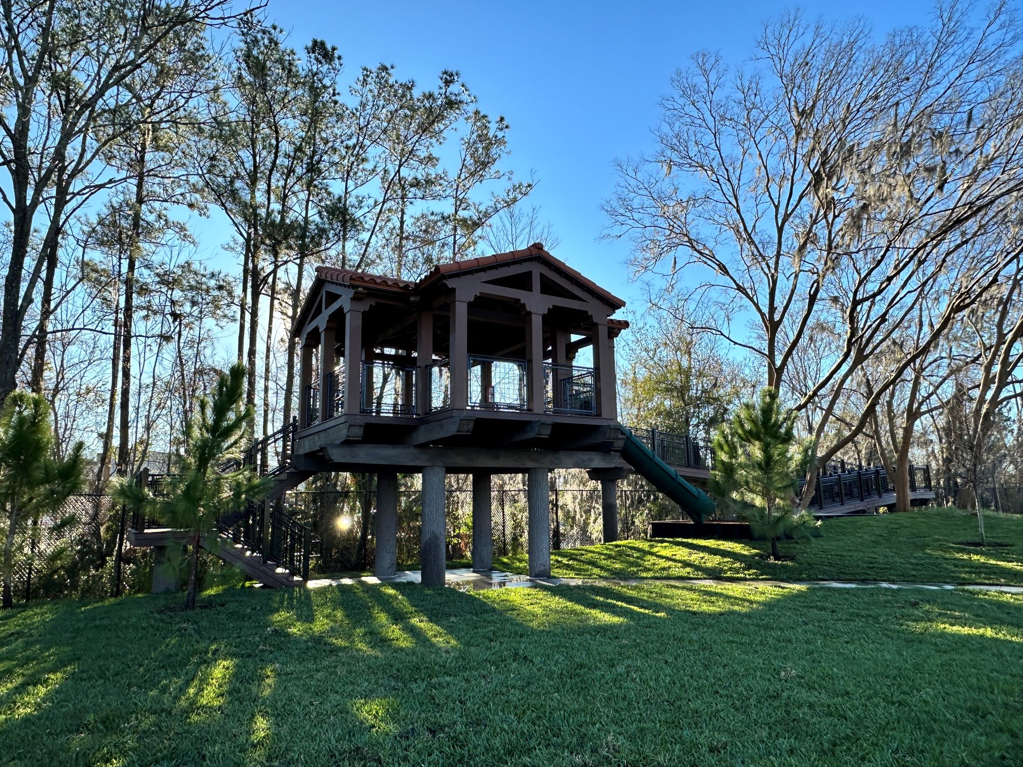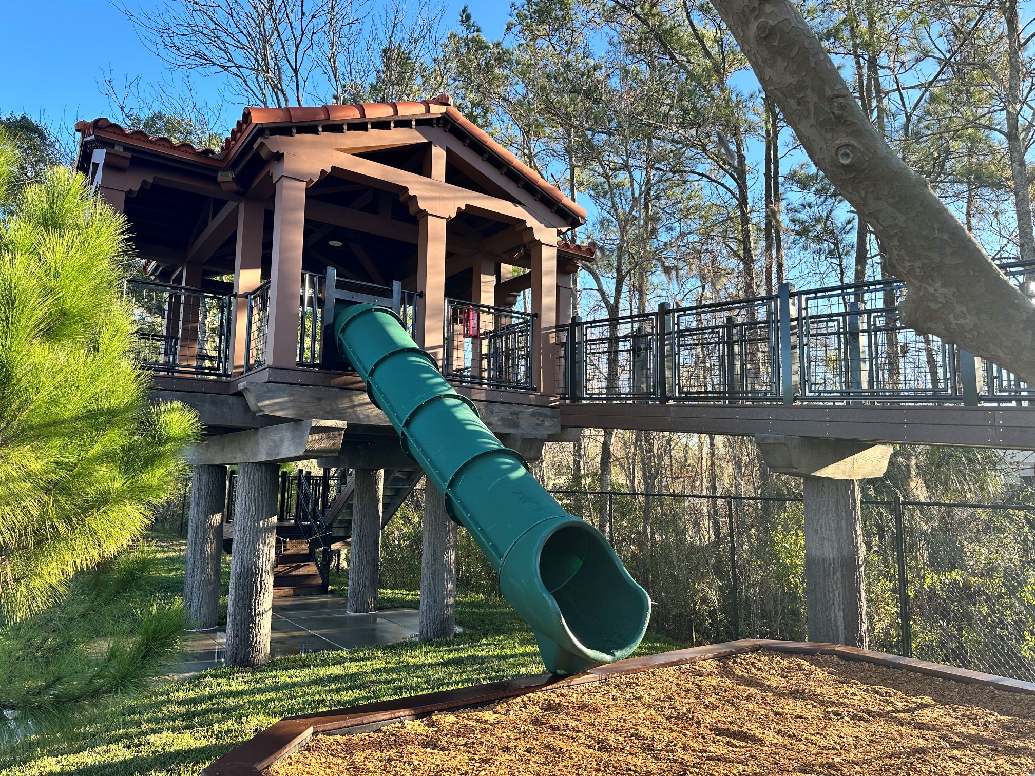 Construct new treehouse/utility play structure with stair, ramp and slide for private school. Treehouse is constructed of concrete footigns, concrete columns, concrete main beams and cross beams, plastic lumber joists, plastic lumber decking, steel framing, PVC column truss wraps, plastic lumber roof framing and 3/4″ plastic lumber decking, 3/4″ plywood, underlayment and clay tile roofing.