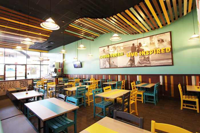 Established in the western United States, this popular Baha Mexican style restaurant is making its eastern debut in Gainesville, FL. This 3,250 square foot interior build out for the new Costa Vida Fresh Mexican Grill restaurant was completed in the new Archer Centro West retail strip center located on Archer Road. Complete with a small office, full commercial kitchen, a walk in cooler, service line and food prep area, the space also holds a 30 table dining room. The décor and color scheme create a relaxed beachy feel complete with wood slatted waves hanging from ceiling and a logo bubble wall that changes colors and gives the sense of waves crashing. Outdoor seating is also provided under the strip center canopy.