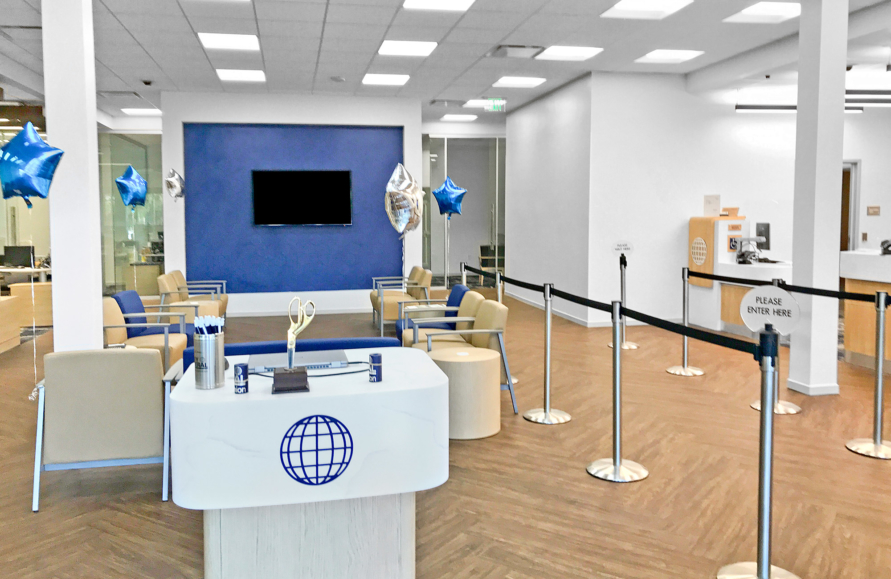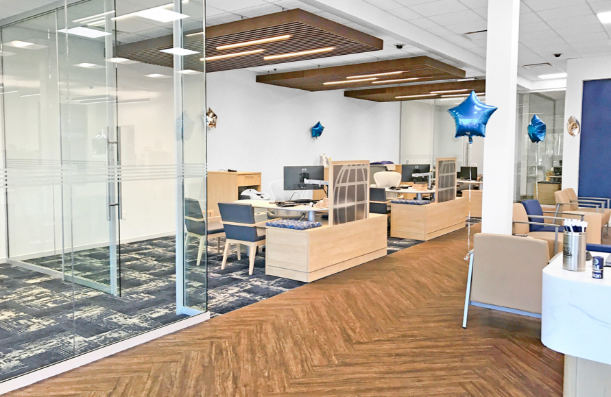 Complete renovation of active credit union including interior demolition, new partitions, ceilings, flooring and paint mechanical equipment, lighting, plumbing associated with relocated restrooms including new sanitary piping. Project was phased to allow banking operation and customer service to continue. Careful daily coordination, temporary teller lines, night work and negative air management for dust control contributed to the project success and customer satisfaction. This branch does not have a drive through teller service which resulted in greater customer activity inside the branch throughout the project making it a challenge that required diligent coordination with branch staff.
